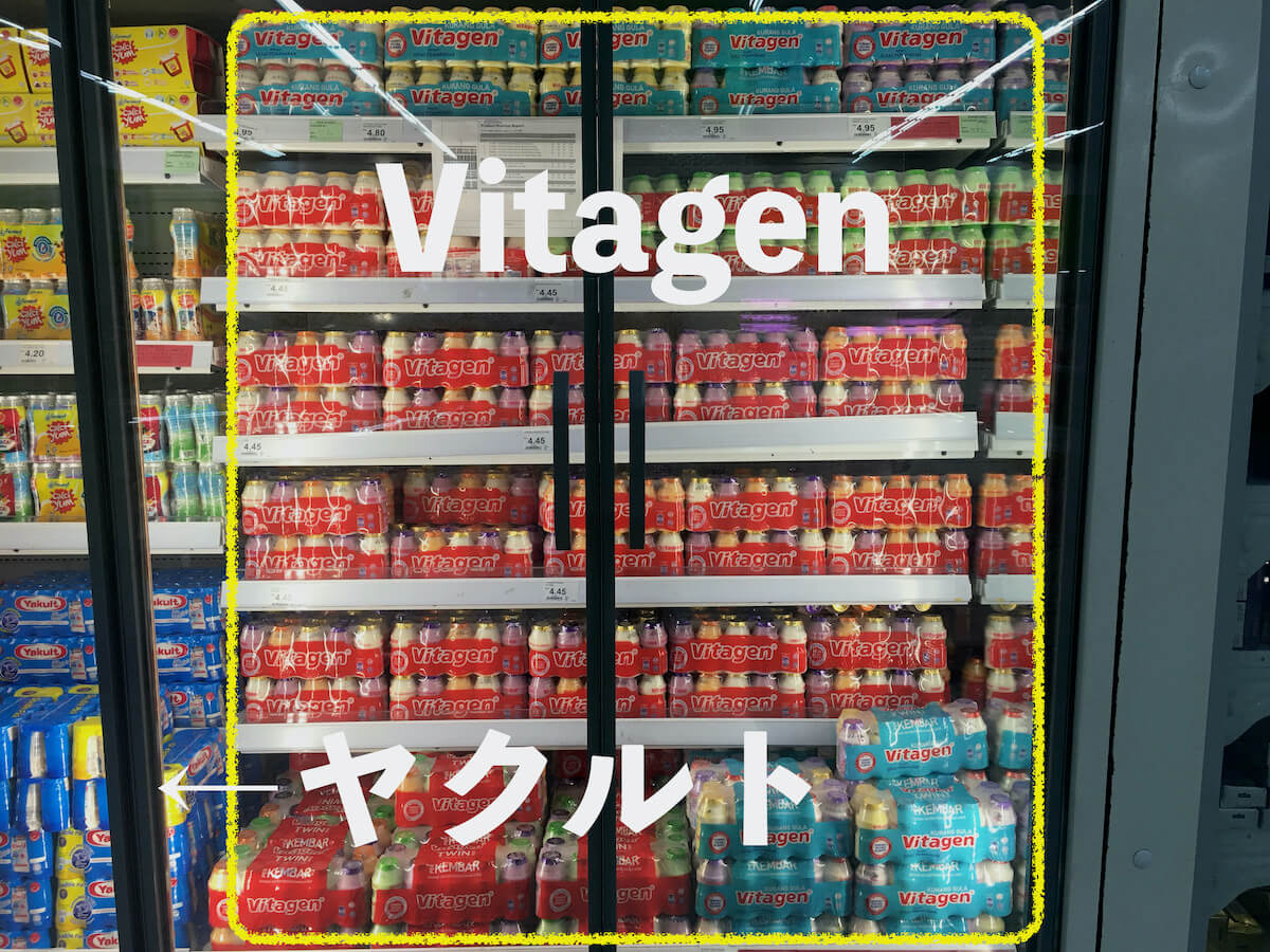 競合他社は、Malaysia Milk SDN BHD(マレーシアミルク)で、商品はヤクルトにそっくりな「Vitagen(バイタジェン)」です。発売年は「1977年」なので、マレーシアミルクに先行者利益をガッツリ持っていかれた感じですね。両商品の売り場を見てもらえれば、どれだけ差があるかが一目瞭然です。