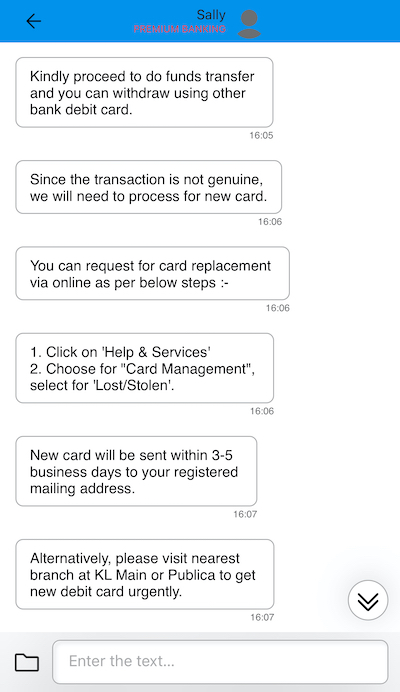 • 不正取引によりカードの再発行が必要な場合、①オンラインで依頼するか、急ぎの場合は②KLのメイン店舗またはPublicaのブランチに出頭して再発行してもらうことができます。